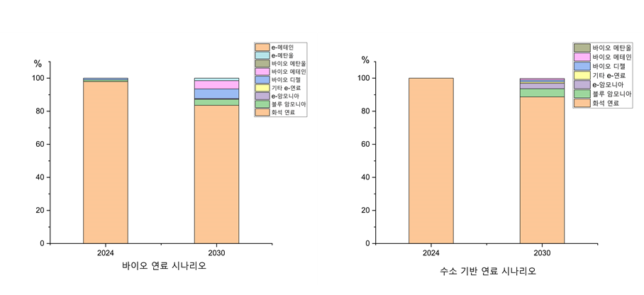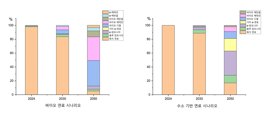 하지만 이러한 전망은 특정 연료 기술의 시장 선점 또는 생산 및 보급 시스템의 시의성에 따라 달라질 수 있으며, 그림 2와 같이 바이오연료 기반의 연료 또는 수소 기반의 연료가 해운 시장의 주 연료로 활용되는 시나리오에 따라 상이한 전망이 그려진다. 또한, 이러한 시나리오에 기반한 2050년 해운 시장 연료 전망은 그림 3과 같이 더욱 뚜렷한 차이점을 보인다.