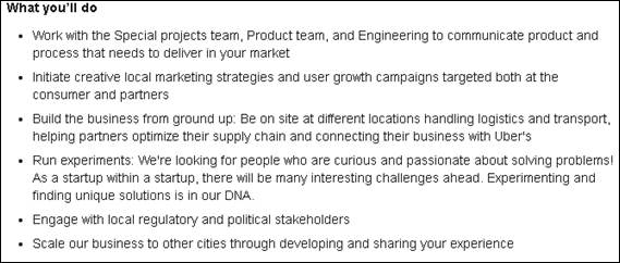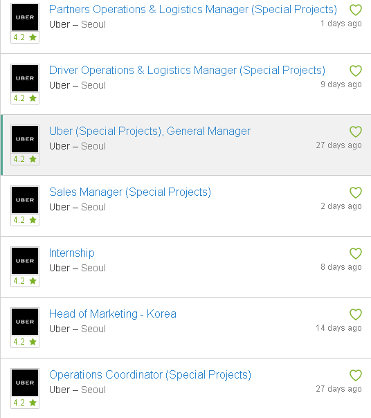 우버가 채용정보 사이트 글래스도어(Glassdoor)에 올린 최근 한 달 동안의 공고에 따르면 우버는 스페셜 프로젝트를 담당할 지사장(General Manager), 드라이버 운영 및 물류 담당자(Driver Operations &Logistics Manager), 파트너 운영 및 물류 담당자(Partner Operations &Logistics Manager) 등을 채용하고 있다.