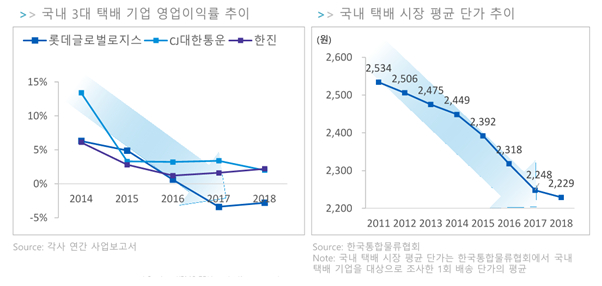 그림1. 국내 택배 3사의 영업이익률 및 택배 평균 단가 추이 (자료: 삼정KPMG)