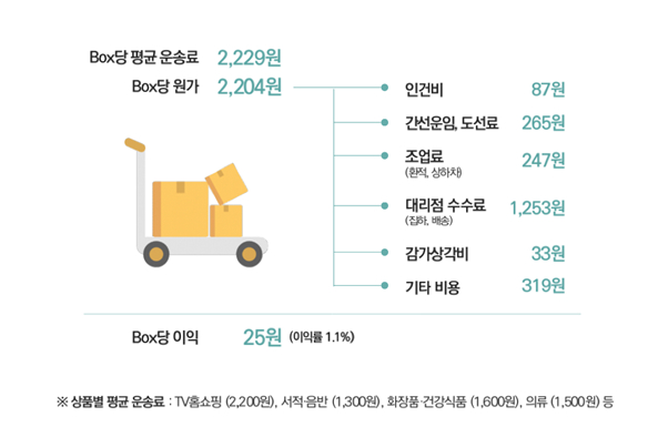 - 위 Figure 2를 살펴보면 택배 운송료는 박스당 2,229원 수준임. 박스당 원가 2,204원을 제외하면 영업이익은 개당 25원 정도임 - 원가 분석을 좀 더 깊게 살펴보면 인건비 87원, 간선운임(도선료) 265원, 조업료(환적, 상하차) 247원, 대리점 수수료(집하, 배송) 1,253원, 감가상각비 33원, 기타 319원으로 구성됐음. CJ, 한진, 롯데 등 택배 회사마다 차이가 있을 수 있지만 엇비슷한 구조임 - 상품(채널)별 평균 운송료는 TV홈쇼핑 2,200원, 서적/음반 1,300원, 화장품/건강식품 1,600원, 의류 1,500원 등임 - 흥미로운 점은 배달 대행 이륜차 운송비가 택배와 비슷한 2,500원 수준이라는 점임. 지난해까지 3,000원대를 유지하던 것이 올해 들어 2,500원대까지 떨어졌다는 게 현장 관계자의 말임. 배달의민족, 요기요 등 음식 주문 플랫폼 수수료 조정과 더불어 배달 대행 업체들끼리 더 많은 물량 수주를 위해 제살깎아먹기식 출혈 경쟁을 하는 것임