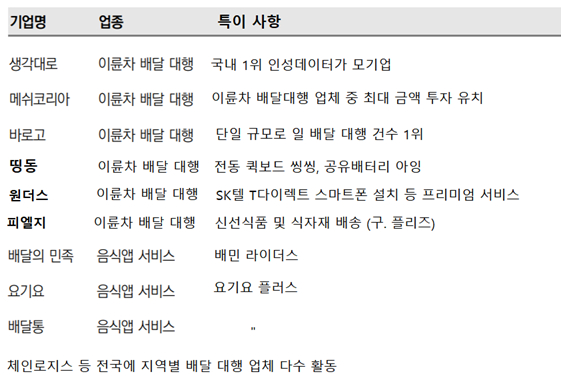 - 이 때문일까. 배달 시장도 변화된 흐름에 적응하기 위해 몸단장이 한창임. 시장 점유율을 높이고, 서비스 카테고리를 확장하기 위해 적합한 파트너를 물색 중임 - 국내 배달 대행 시장의 원조인 띵동은 시장 1위인 배달의민족이 독일계 회사인 딜리버리 히어로(요기요+배달통)에 인수되자 음식 및 마트 배달시장을 지키겠다며 ‘생각대로+바로고’와 토종 배달 연합을 가동했음. 시장 독과점과 소상공인 피해를 막기 위해 주문 수수료를 2%로 내렸음. 힘을 모아 사세를 키우려는 모양새임 - 원더스는 프리 IPO(기업공개)를 통해 코스닥 상장을 준비 중임. 일반 배달 대행 서비스에서 스마트폰 개통 등 소형 전자제품 설치와 중고폰 거래 플랫폼을 만들기 위한 작업이 한창임. 배달사원을 영업사원으로 둔갑시키기 위한 교육에 집중하고 있는데, 이는 물류망에 판매망을 얹기 위한 전략으로 풀이됨