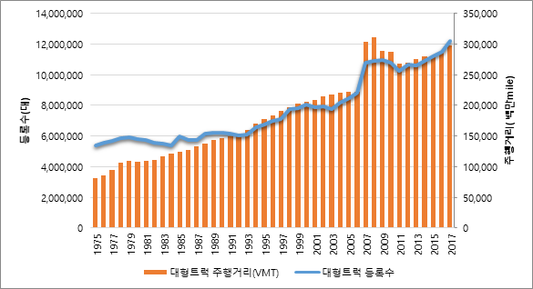- 미국 대형 화물자동차의 등록대수는 1975년 530만대에서 연평균 2% 증가해 2007년에는 1,000만대를 넘어섰고 최근에는 1,220만대(‘17년 기준) 임 - 이에 대형 화물자동차의 주행거리(Vehicle Mile Traveled·VMT) 또한 지속적으로 증가했고, 1975년 810억mile에서 2017년 3,000억 mile에 육박하고 있음 (대형 화물자동차의 주행거리 연평균증가율은 3% 임)