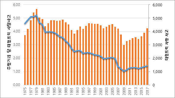 그림2. 미국의 대형 화물자동차 기인 사망사고 추이(1975년-2017년)